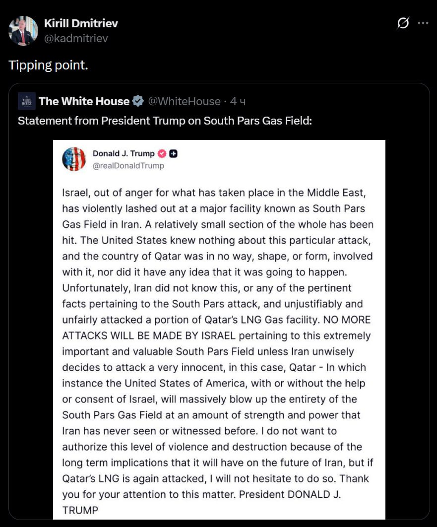 Израиль больше не будет наносить удары по иранскому газовому месторождению «Южный Парс», если Тегеран не будет нападать на Катар. Но если Иран нанесет удар, то США уничтожат «Южный Парс», - Трамп
