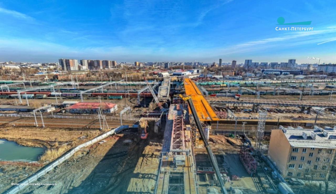 троители завершили надвижку пролётного строения путепровода правого направления над Октябрьской железной дорогой. Работы проводились в технологические «окна» в движении поездов. Свою позицию на опорах 4-7 заняли конструкции пролётного строения общей протяжённостью 247 метров. Теперь их опускают на предпроектные отметки. Помимо этого, выполняется монтаж металлоконструкций остальных пролётов.