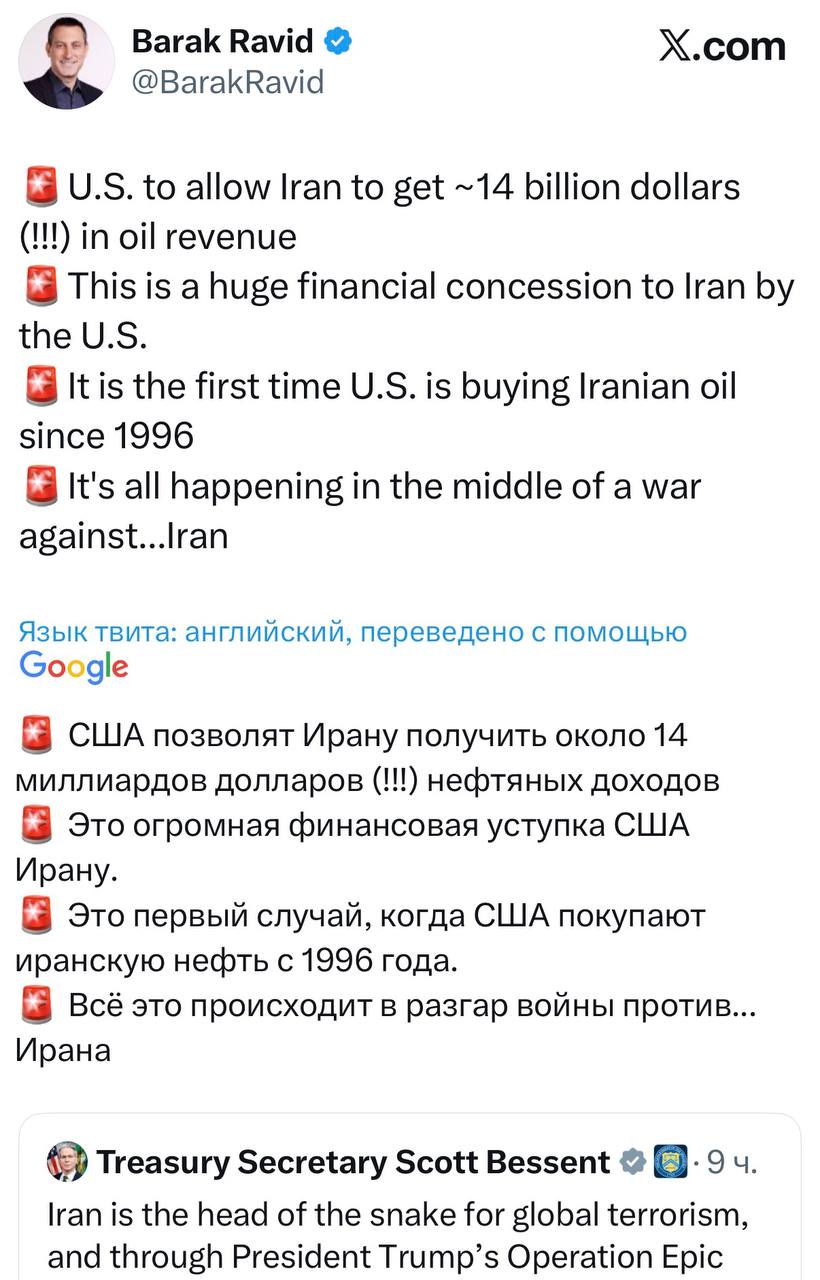 «США позволят Ирану получить около 14 миллиардов долларов доходов от нефти. Это огромная финансовая уступка Тегерану и первый с 1996 года случай, когда Соединённые Штаты фактически покупают иранскую нефть — причём прямо во время войны против Ирана»