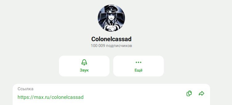 Есть первые 100 000 подписчиков в MAX https://max.ru/colonelcassad