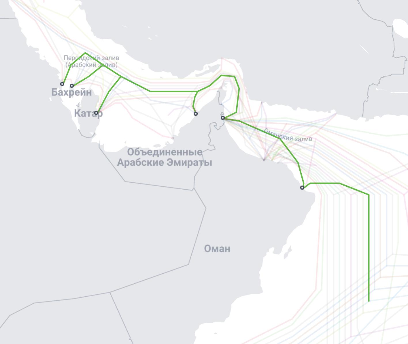 - Tata TGN-Gulf: Кольцевая сеть, обеспечивающая связность между Оманом, ОАЭ, Катаром, Бахрейном и Саудовской Аравией.