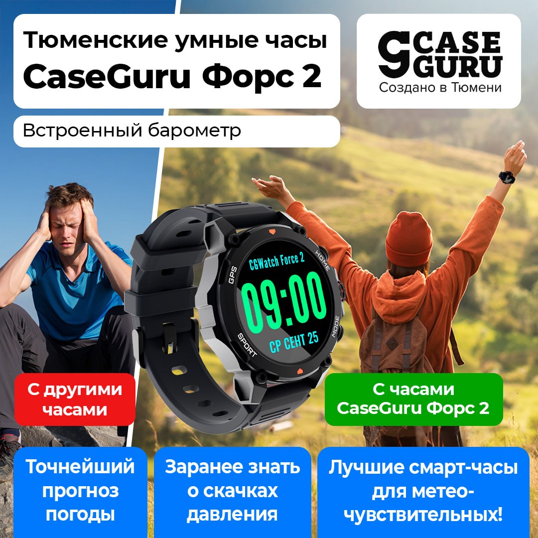 Тюменские часы CaseGuru Форс 2 — с бронированным корпусом и влагозащитой от брызг. Масса функций, работающих без сети: GPS, компас, альтиметр и барометр, который позволяет предвидеть скачки атмосферного давления. Мечта метеозависимых!