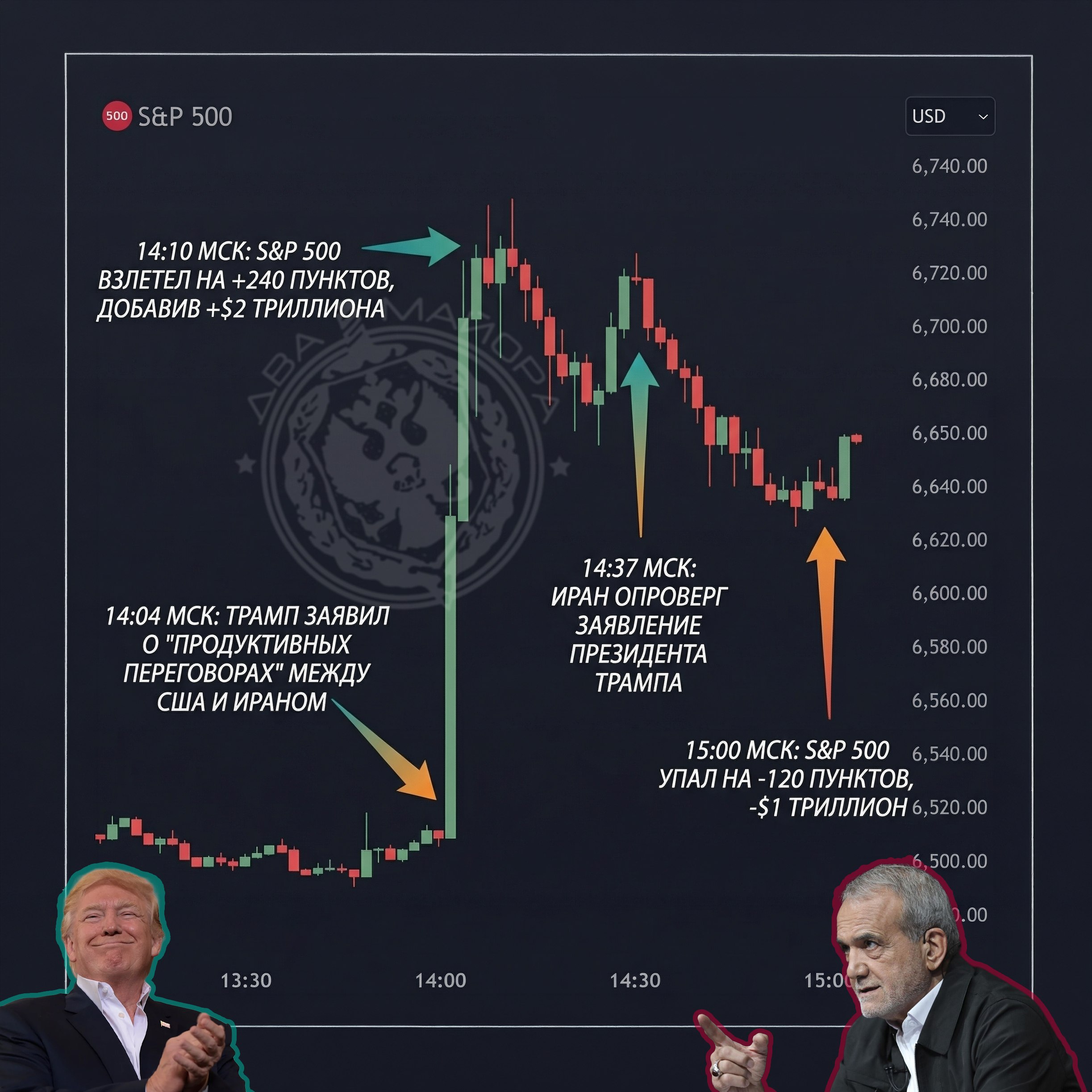 Всего через несколько минут стоимость американского фондового рынка (S&P 500) выросла на $2 триллиона . Примерно через час Телеграм прогружает новость в Иране, и там официально опровергают вброс американца: никаких переговоров не было. Рынок летит вниз, теряя $1 триллион.