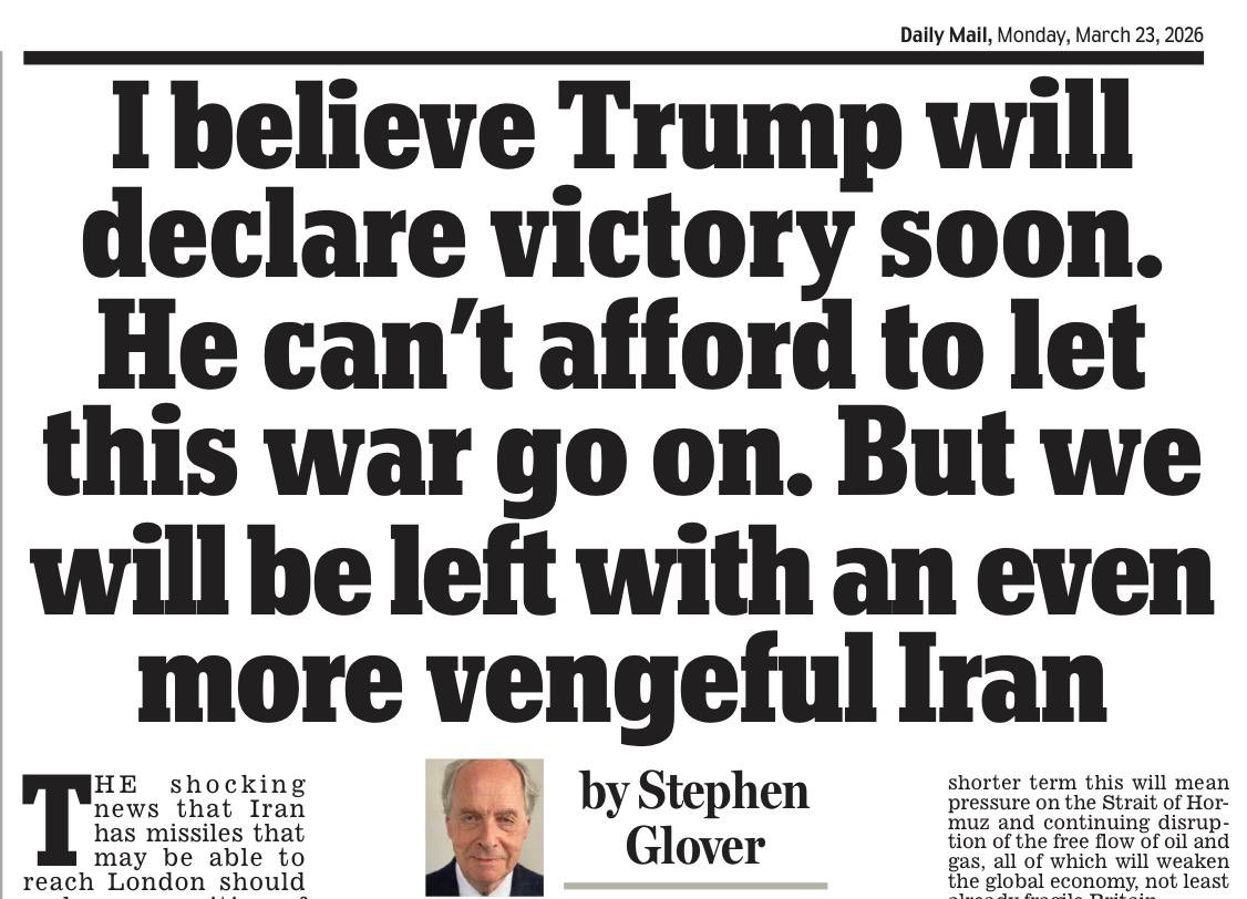 «Верю, что Трамп вскоре провозгласит свою победу. Он не может позволить себе вести эту войну дальше. Но мы останемся с еще более мстительным Ираном». Под таким заголовком на страницах Daily Mail публикует свою колонку ветеран британской журналистики Стивен Гловер.
