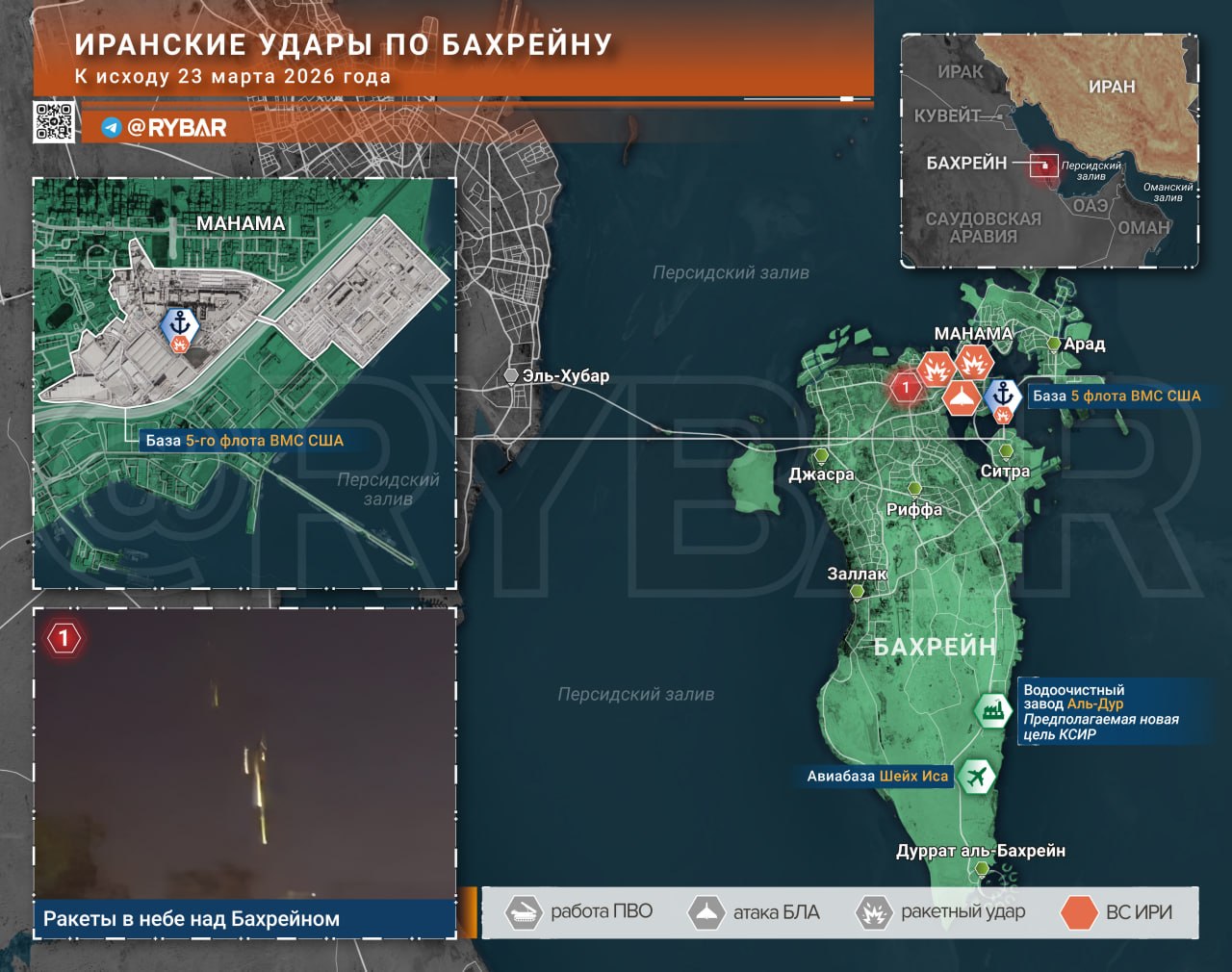 В Бахрейне зафиксированы удары иранских дронов и ракет над Манамой. Целью, по имеющимся данным, стали американские объекты, включая базу Мин Салман и водоочистный завод Аль-Дур.