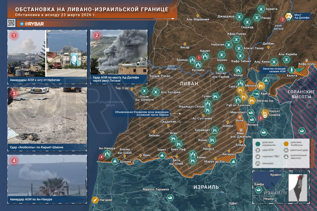 В Ливане израильтяне продолжают продвижение в районе Кфар Шубы и Хальты, бьют по южным районам страны и к исходу дня разрушили мост Ад-Даляфи через Литани. В ответ «Хезболла» обстреляла районы Северной Галилеи.