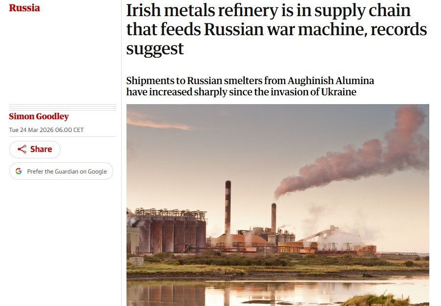 Британская The Guardian недовольна тем, что российский глиноземный завод в Ирландии (принадлежит 'Русал') поставляет в Россию слишком много сырья для очистки алюминия, который потом ‘используется для российской военной машины’.