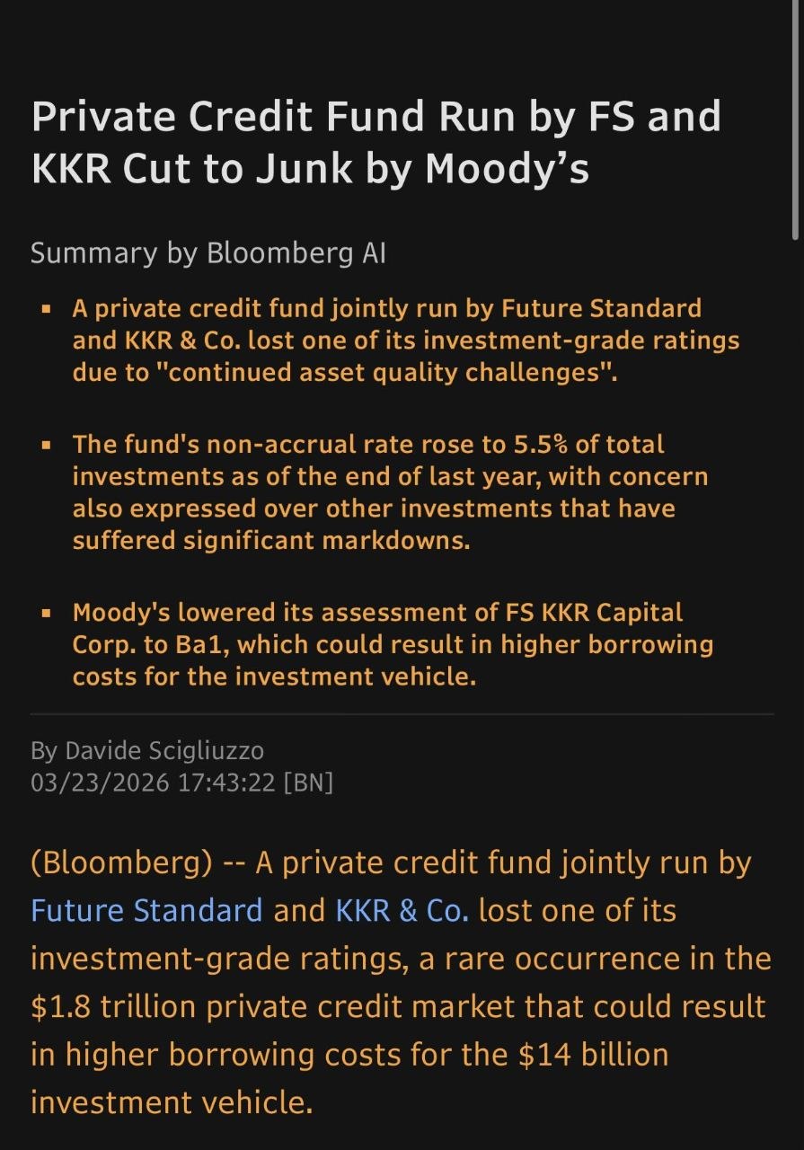 Один из крупнейших в мире фондов Apollo ограничил вывод средств из одного из своих фондов частного кредитования после того, как запросы на вывод подали более 11% владельцев его бумаг. Также сегодня понижен до мусорного рейтинг аналогичного огромного фонда от Future Standard и KKR. Это указывает на то, что раковая опухоль на рынке частного кредитования растет.