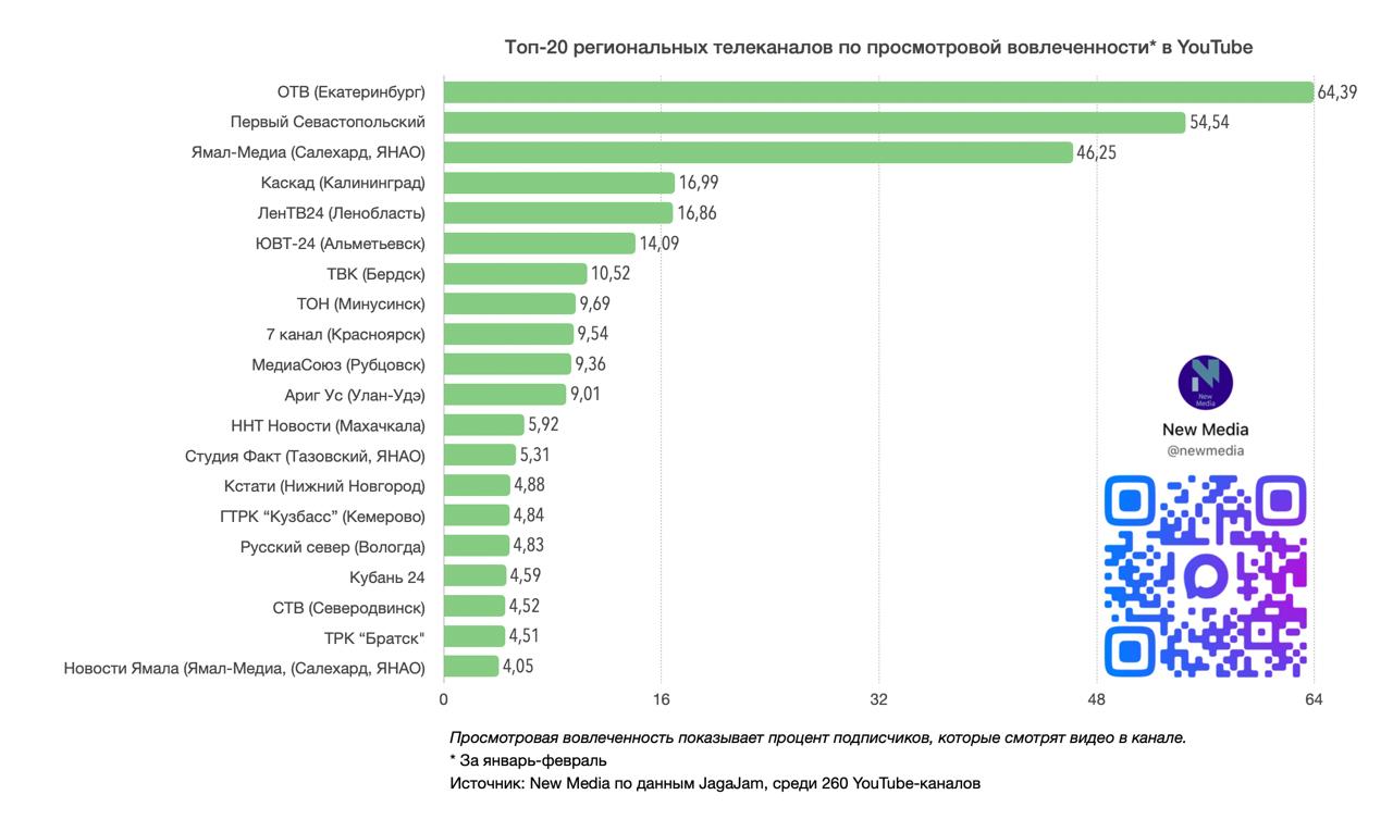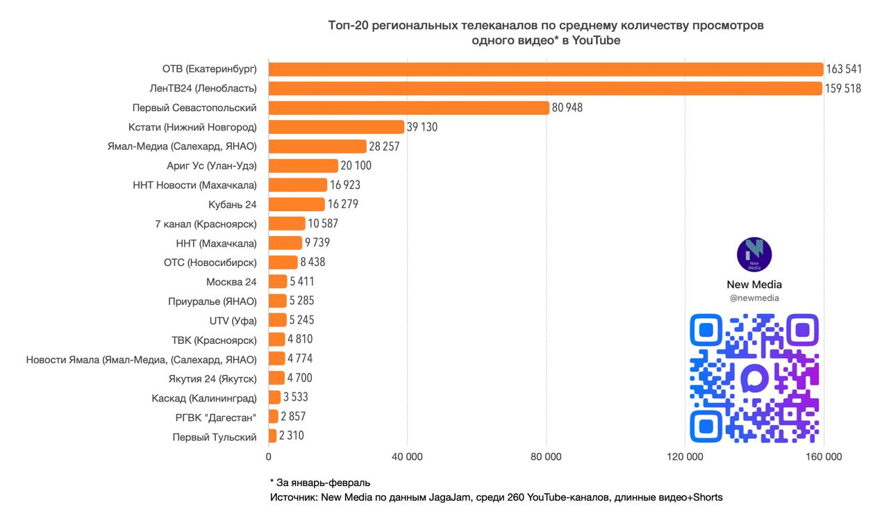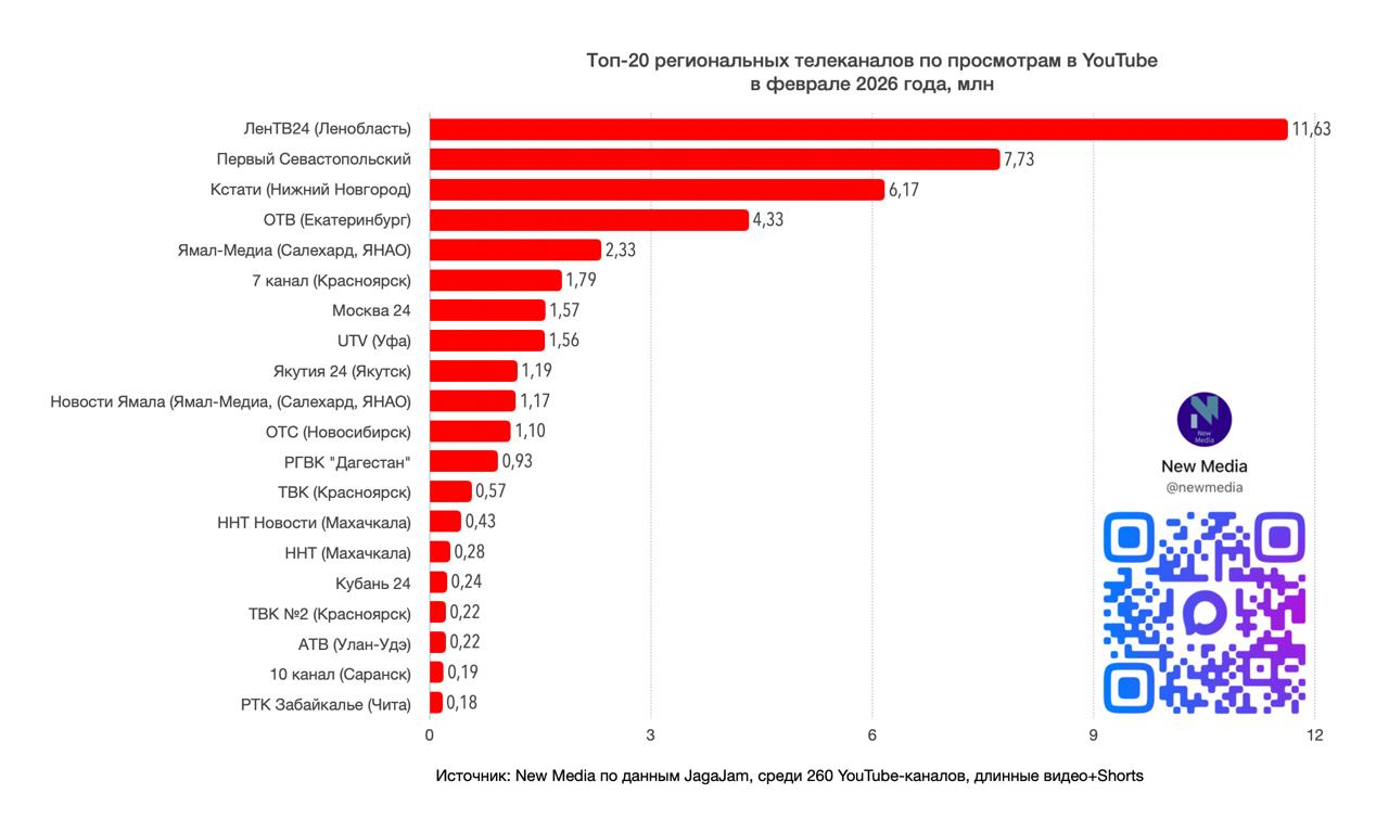 Топ-20 региональных телеканалов в YouTube в феврале 2026 года