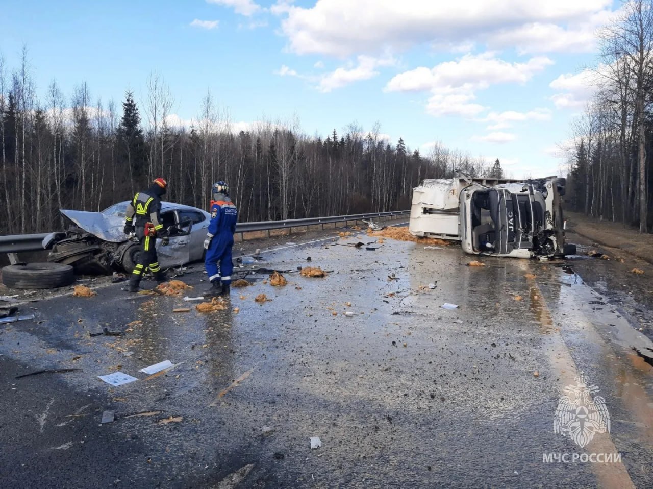 Владелец легковушки скончался. Водитель грузовика получил травмы, ему помогли медики. Разлива топлива не обнаружено, риска возгорания нет.
