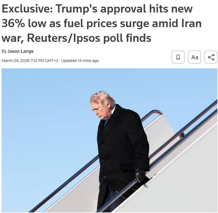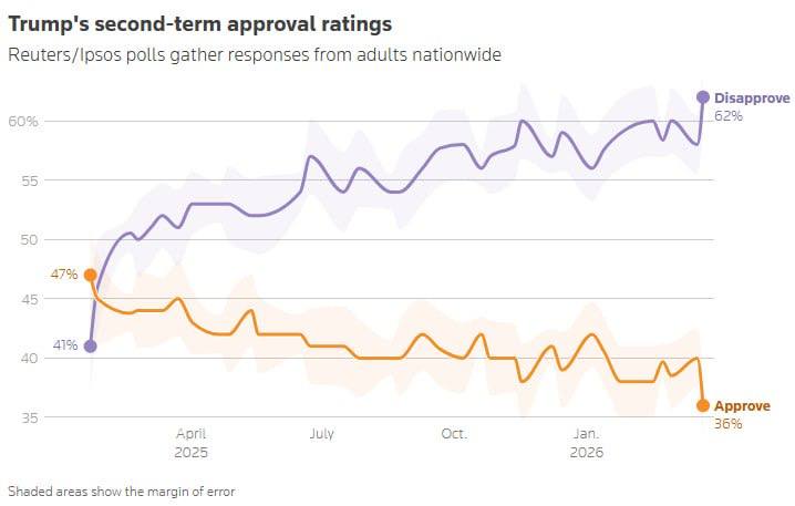 Это самый низкий показатель с момента возвращения американского президента в Белый дом, судя по статистике Reuters/Ipsos.