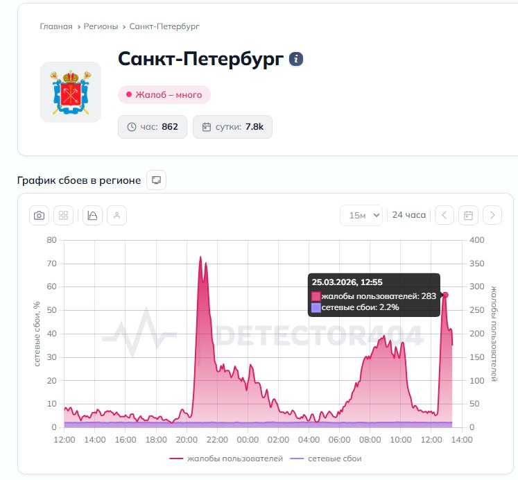 Ещё один крупный скачок жалоб на работу интернета регистрируется в Петербурге — уже второй с утра.