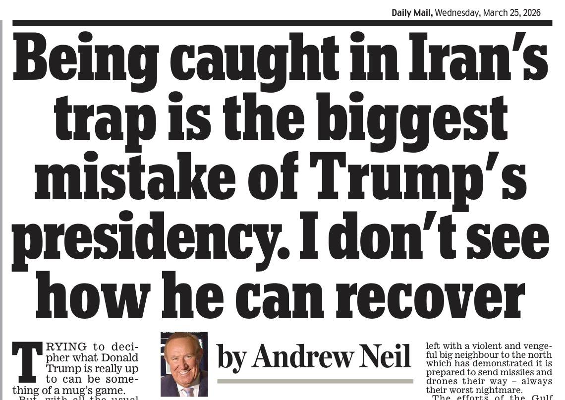«Попадание в иранскую ловушку — самая большая ошибка президентства Трампа. Не вижу, как он сможет оправиться». Под таким заголовком на страницах Daily Mail публикует сегодня статью известный британский журналист и телеведущий Эндрю Нил. Автор пишет: