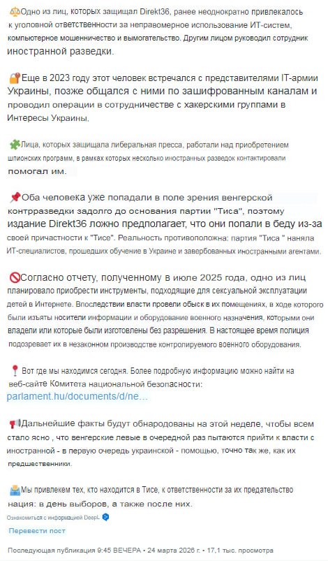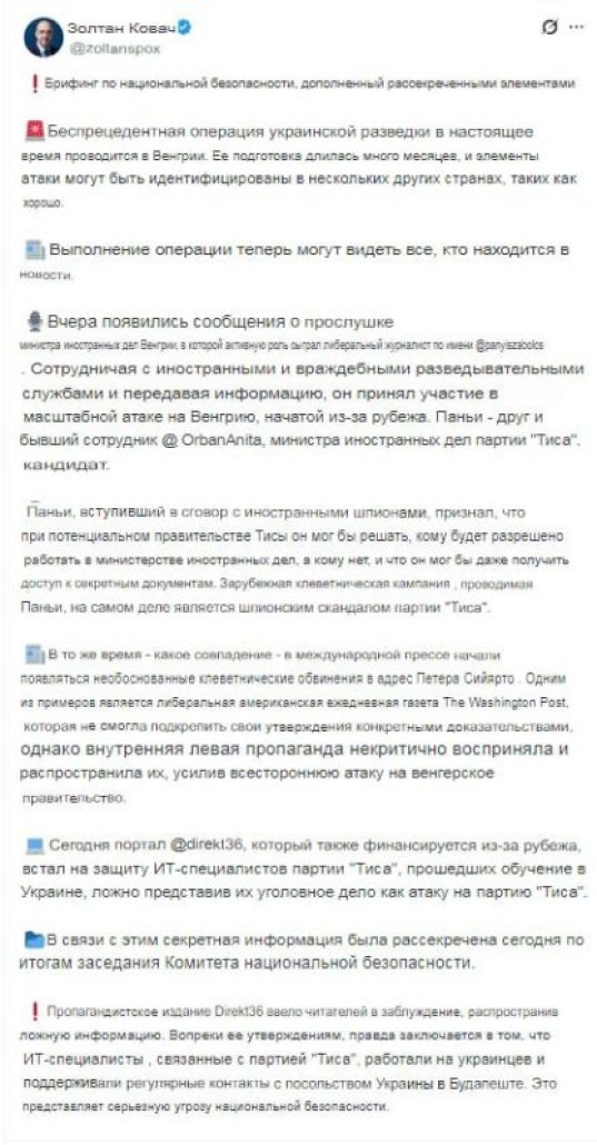 «Сегодня портал Direkt36, который также финансируется из-за рубежа, встал на защиту прошедших обучение в Украине ИТ-специалистов партии «Тиса», ложно представляя уголовное дело против них как нападение на партию «Тиса». Правда заключается в том, что ИТ-специалисты, связанные с партией «Тиса», работали на украинцев и поддерживали регулярные контакты с посольством Украины в Будапеште. Это представляет собой серьёзную угрозу национальной безопасности».
