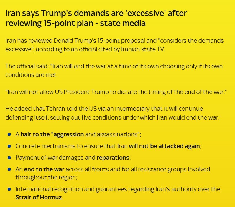 Иран отказался от американского плана по прекращению войны из 15 пунктов и предложил Вашингтону собственный план. В нем всего 5 пунктов.