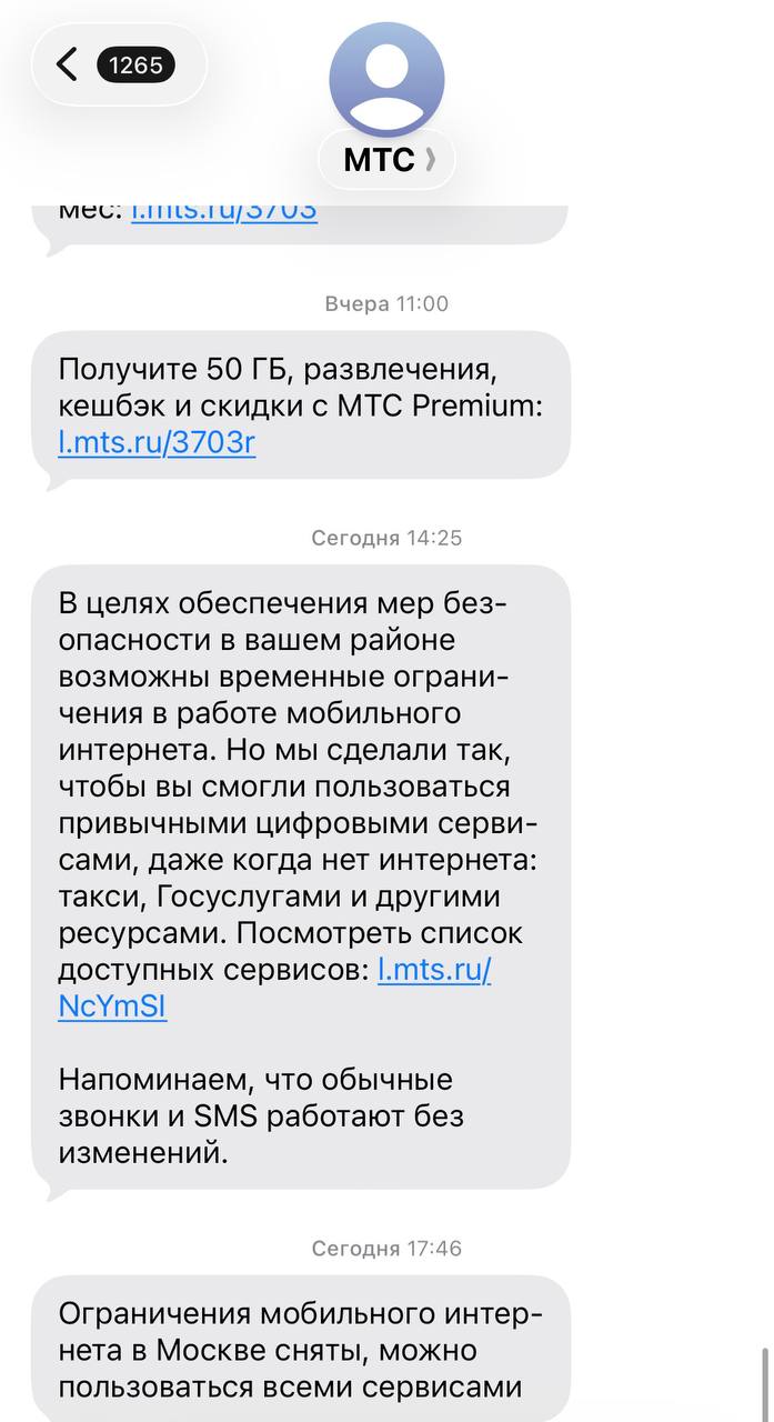 Смешно. Получил сегодня два таких сообщения от МТС: они явно проворонили информирование о введении ограничений в Москве. Поэтому решили проинформировать скопом о введении и снятии. Три недели до этого — это как будто ничего и не было, предлагали купить больше интернета, который не работал