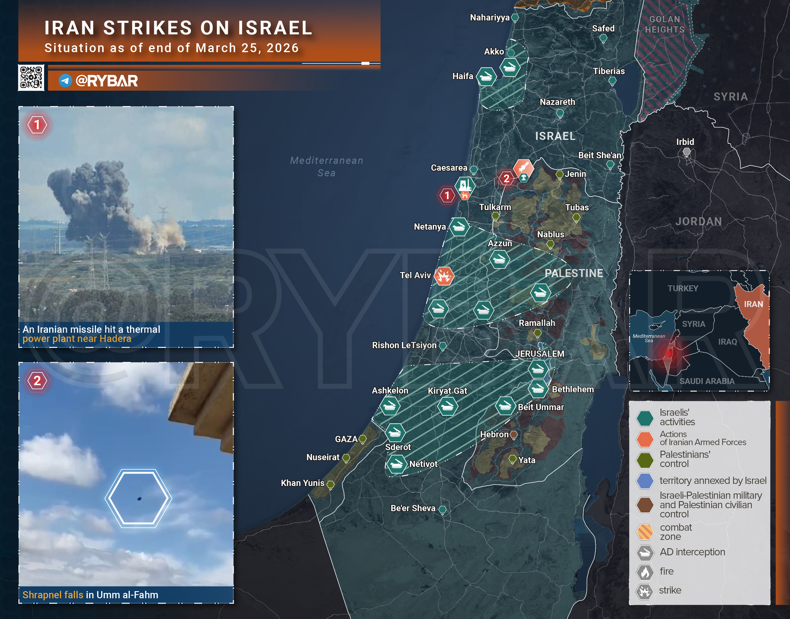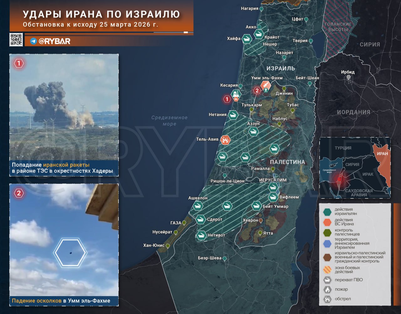 В Израиле целью иранцев стала крупнейшая ТЭС страны в Хадере: боеголовка упала рядом и не нанесла серьезного ущерба. Но иранцы не прекращают обстрелы: израильская ПВО работала над Хайфой, Димоной и другими районами размещения критически важной инфраструктуры.