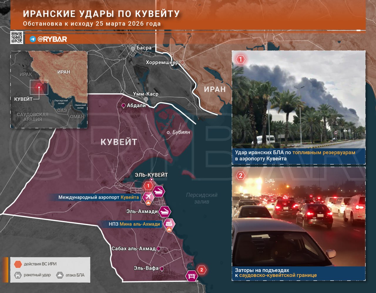 Серьезный ущерб причинен энергетике Кувейта: иранские беспилотники поразили топливные резервуары в международном аэропорту и НПЗ «Мина аль-Ахмади». При этом в стране готовятся к утечкам радиации из-за участившихся ударов коалиции по ядерным объектам Ирана.