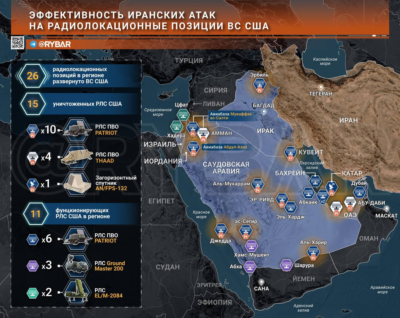 Они не просто были давно известно, но и, как позже выяснилось, не так уж серьезно и прикрывались, что упростило отработку ударов ВС Ирана по ним. В первых волнах иранцам удалось перегрузить ПВО и добиться поражения ключевых РЛС, таких как AN/FPS-132 или AN/TPY-2.