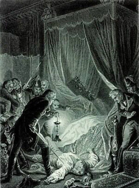 11 марта 1801 года заговорщики к полуночи проникли в новый дворец Павла, Михайловский замок, построенный на месте старого Летнего дворца. Из сорока или пятидесяти человек заговорщиков до комнат Павла дошло человек восемь, и в запальчивом объяснении с ними Павел был убит в отсутствии графа Палена..