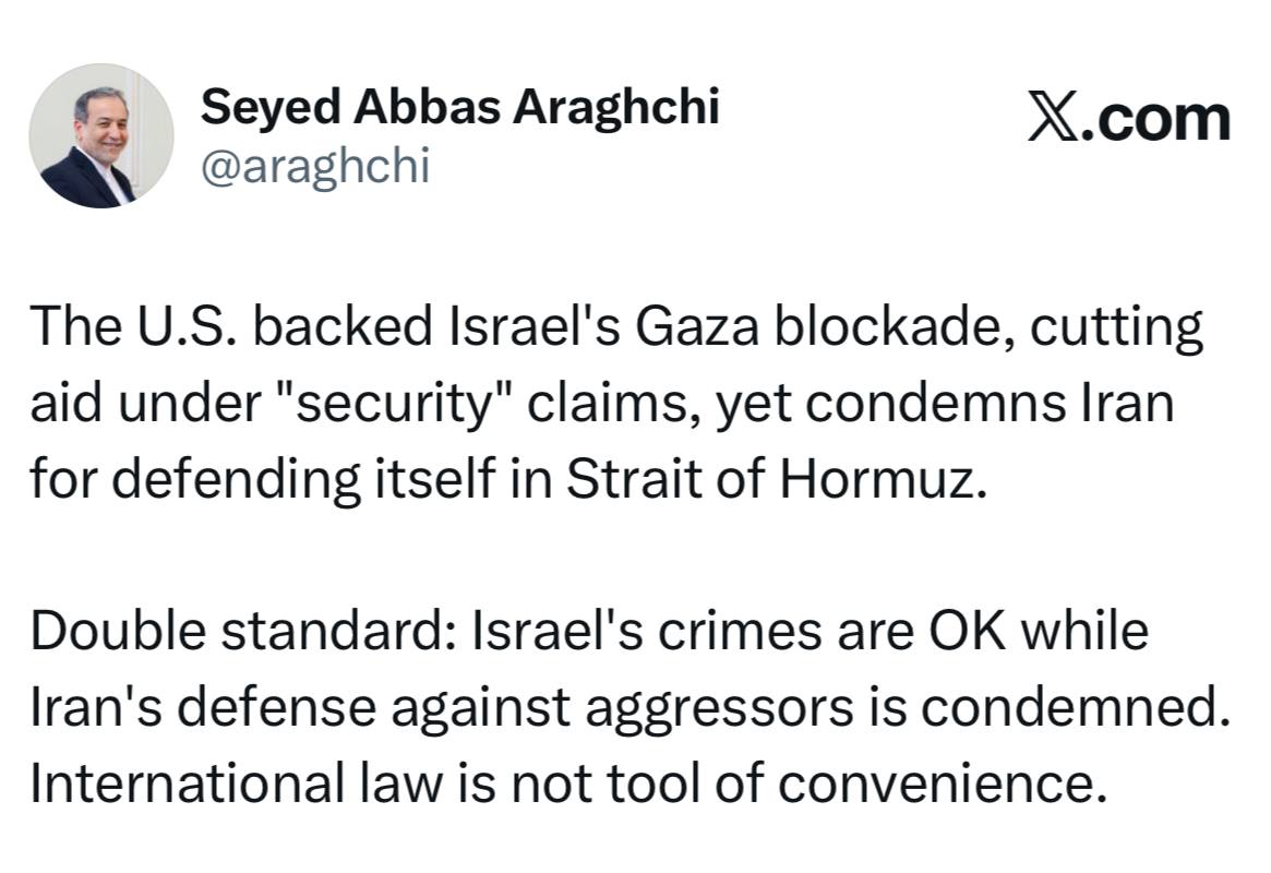Вот и есть двойной стандарт: преступления Израиля считаются приемлемыми, а защита Ирана против агрессоров — осуждается. Международное право не должно быть инструментом избирательного и корыстного применения.