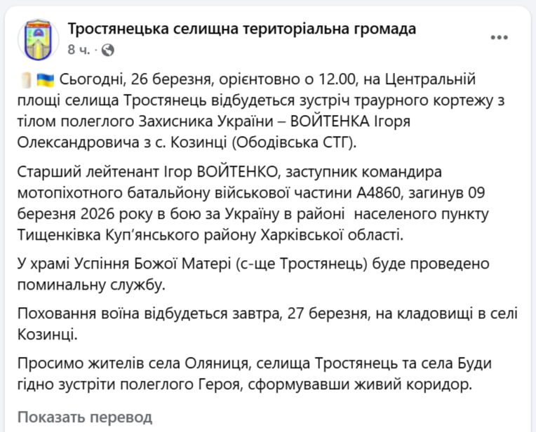 На Купянском направлении ликвидирован заместитель командира батальона 144 омбр ВСУ старший лейтенант Игорь Войтенко.