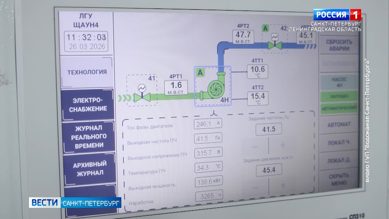 Модернизация в Петергофе. "Водоканал" установил на водопроводной станции "ЛГУ" новые насосы. Старые - проработали полвека и требовали замены. Современные агрегаты сделаны в России и потребляют гораздо меньше электроэнергии, чем их советские "предки". Заодно ведомство внедрило автоматическую систему управления процессом.