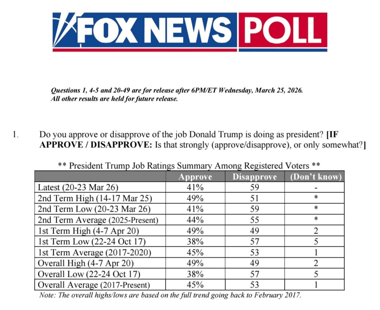 Рейтинг Дональда Трампа пробил историческое дно за оба его президентских срока — свежий опрос Fox News продемонстрировал, что 59% избирателей недовольны его работой. Главным триггером обвала стала военная операция против Ирана — около 60% американцев не одобряют эту ближневосточную авантюру, считая, что это лишь сделает страну более уязвимой.