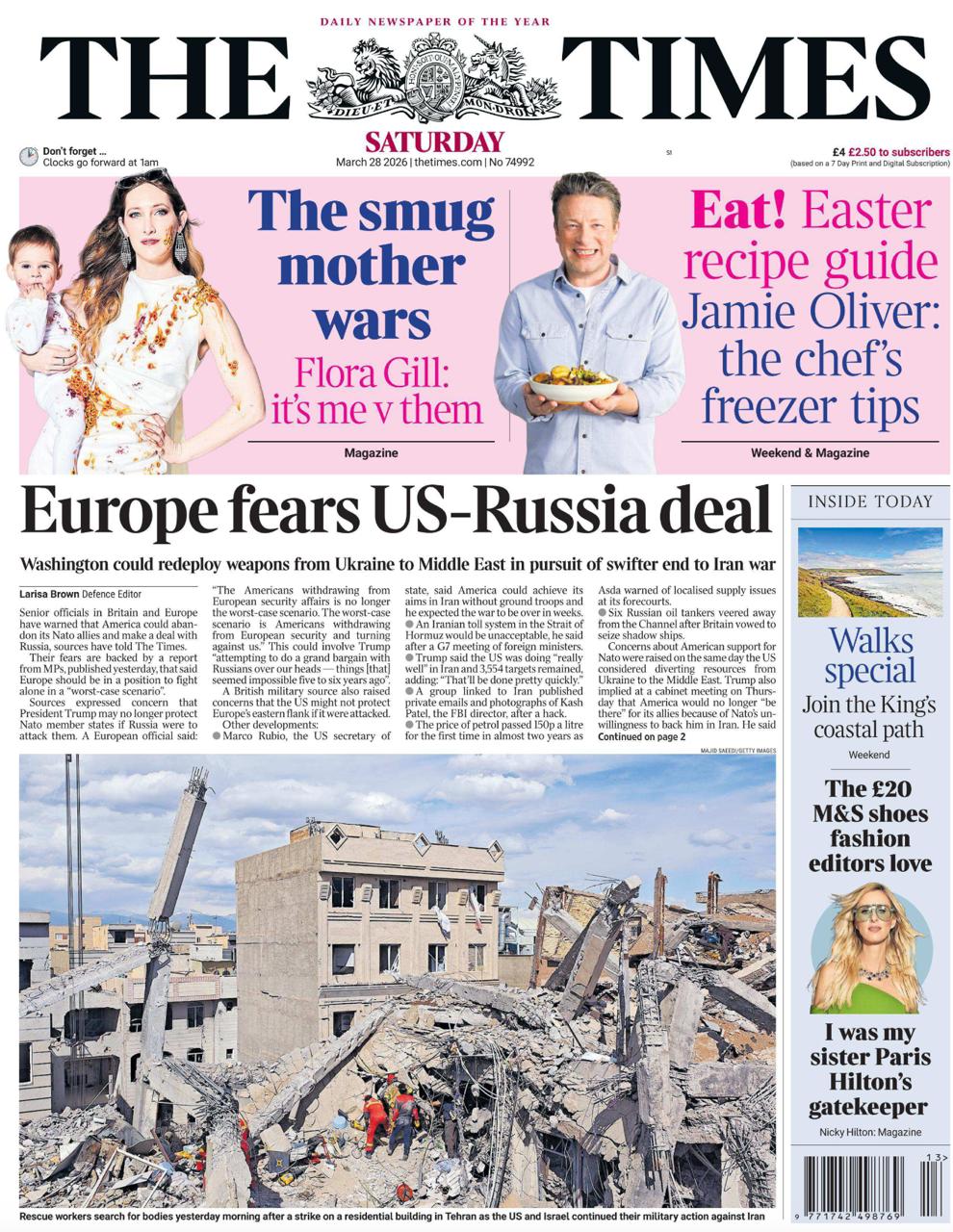 В Британии масса актуальных новостей. Но все равно The Times на первую полосу как главную новость (наряду с пасхальными рецептами от шеф-повара Джейми Оливера, разумеется) выносит страшное известие: «Европа боится сделки между США и Россией»!
