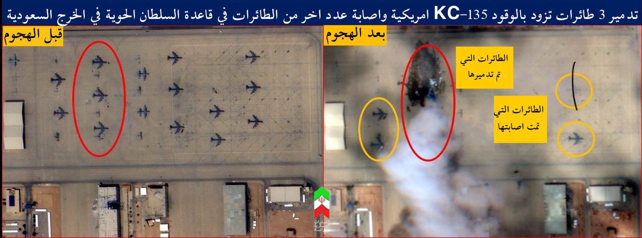 Спутниковые снимки зафиксировали уничтожение (повреждение) трех американских самолетов-заправщиков KC-135 и повреждение нескольких других самолетов, находившихся рядом с ними, на авиабазе Аль-Султан в Эр-Рияде, Саудовская Аравия.