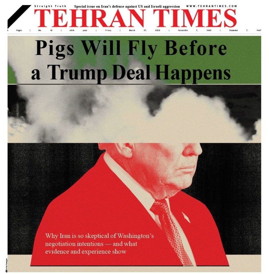 На картинке… Англоязычная Tehran Times вышла с обложкой, на которой изображён президент США, а в заголовке иранский аналог русского выражения «Когда рак на горе свистнет». В дословном переводе звучит как «Скорее свиньи научатся летать, чем случится сделка с Трампом».