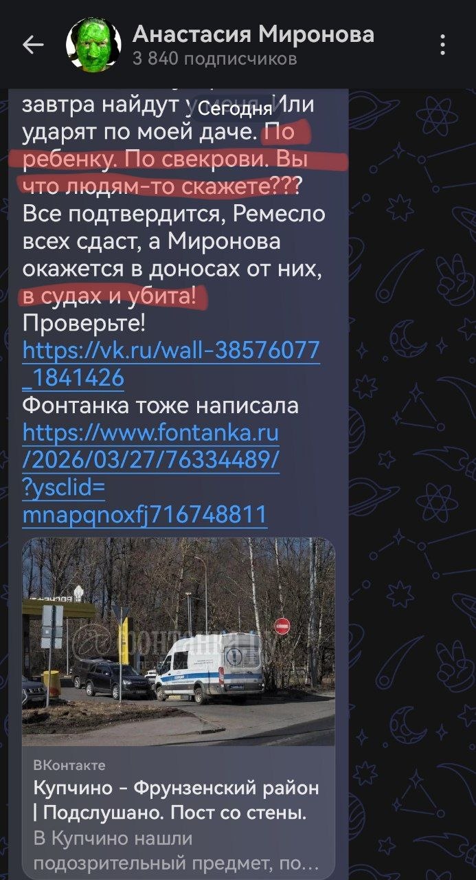 Я сейчас говорю вполне серьёзно. Я считаю, что несовершеннолетний ребёнок, проживающий с женщиной, называющей себя "журналисткой" Мироновой из Санкт-Петербурга, находится в опасности.