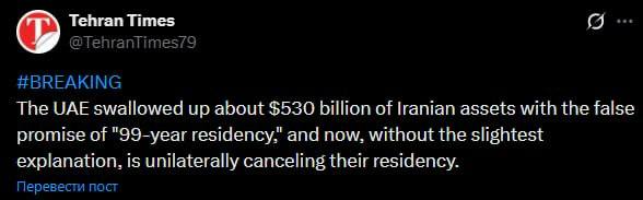 Иранские СМИ сообщают, что ОАЭ массово отменяют ВНЖ иранцам и без объяснений фактически конфисковывают их активы на сумму до $530 млрд.
