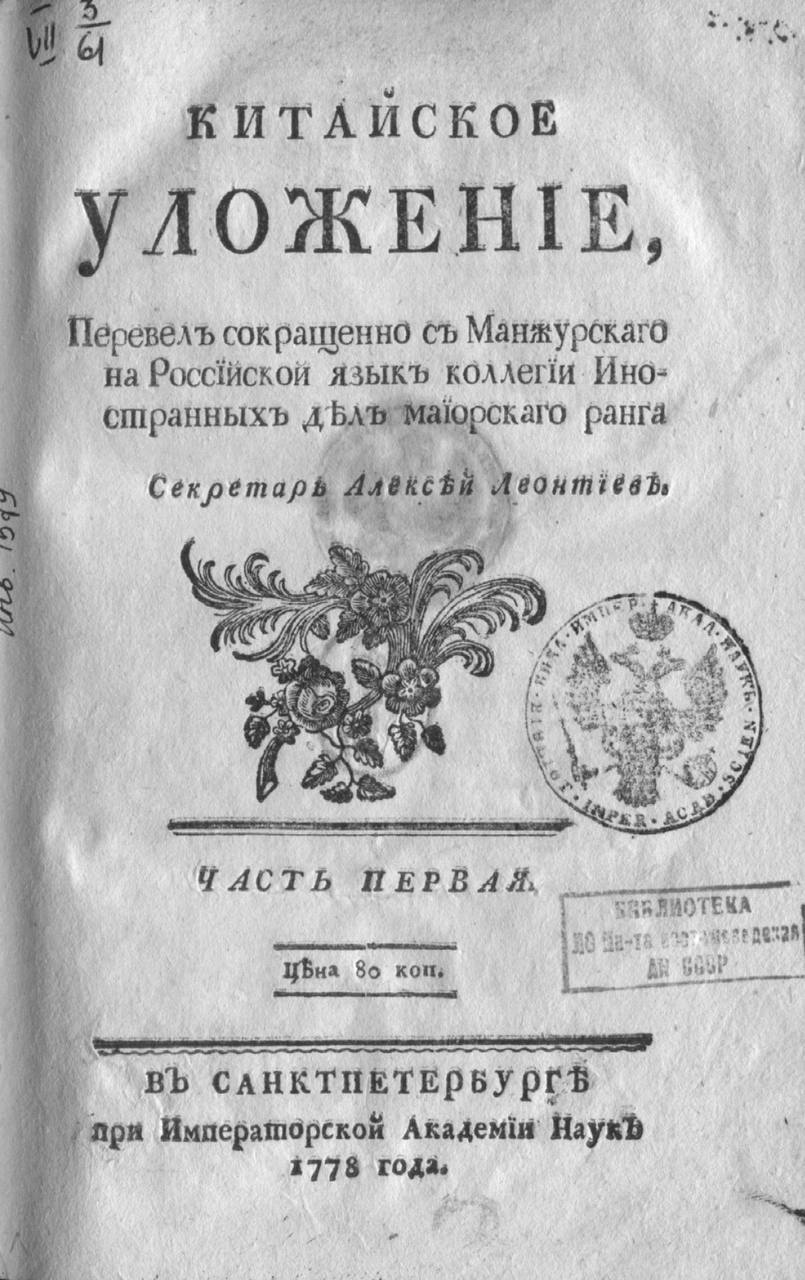 3. Титульный лист первого тома перевода А.Леонтьева с маньчжурского языка «Китайского уложения». Библиотека ИВР РАН. Екатерина II покровительствовала изданиям книг А.Леонтьева, поэтому они печатались за казенный счет и на всех титульных листах отмечена типография Императорской академии наук.