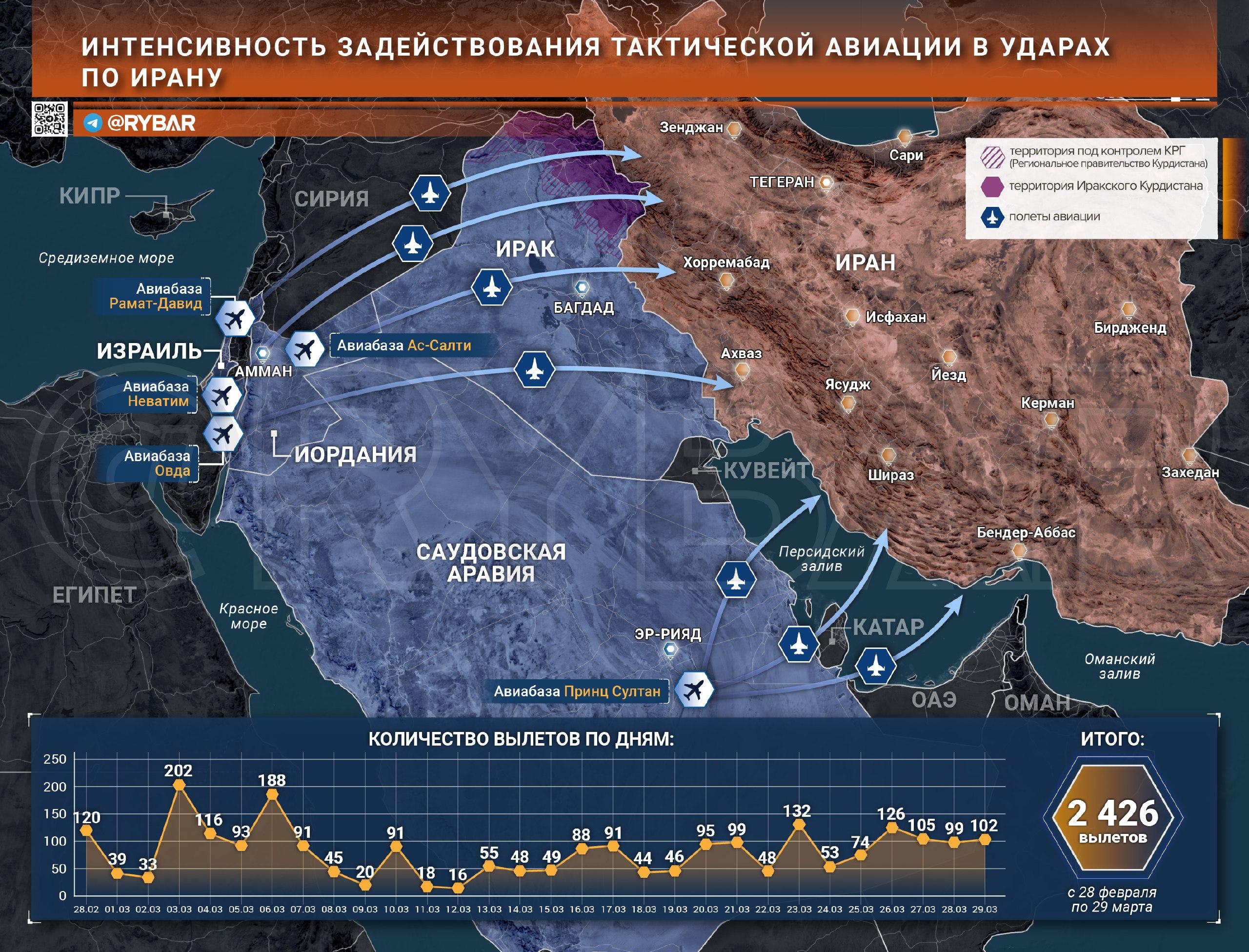 Пик ударной активности пришелся на первые дни войны. В первой декаде марта вообще были значения до 202 вылетов за одни сутки. Именно в те дни иранская территория была под ударами практически повсюду.