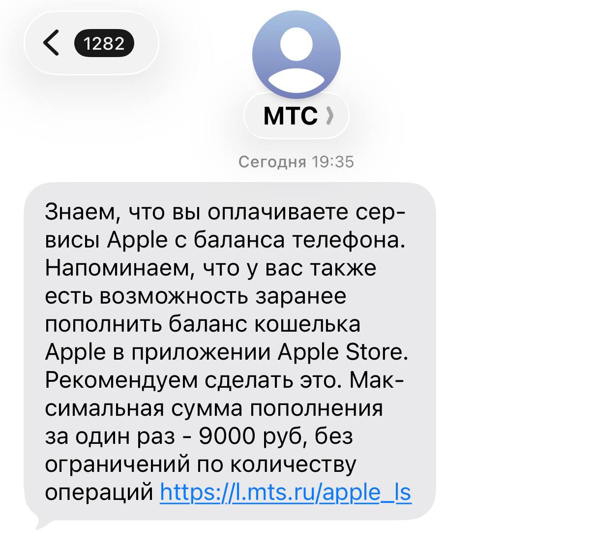 К вечеру МТС прислал ссылку на пополнение баланса кошелька Apple в приложении Apple Store и советует провести пополнение.