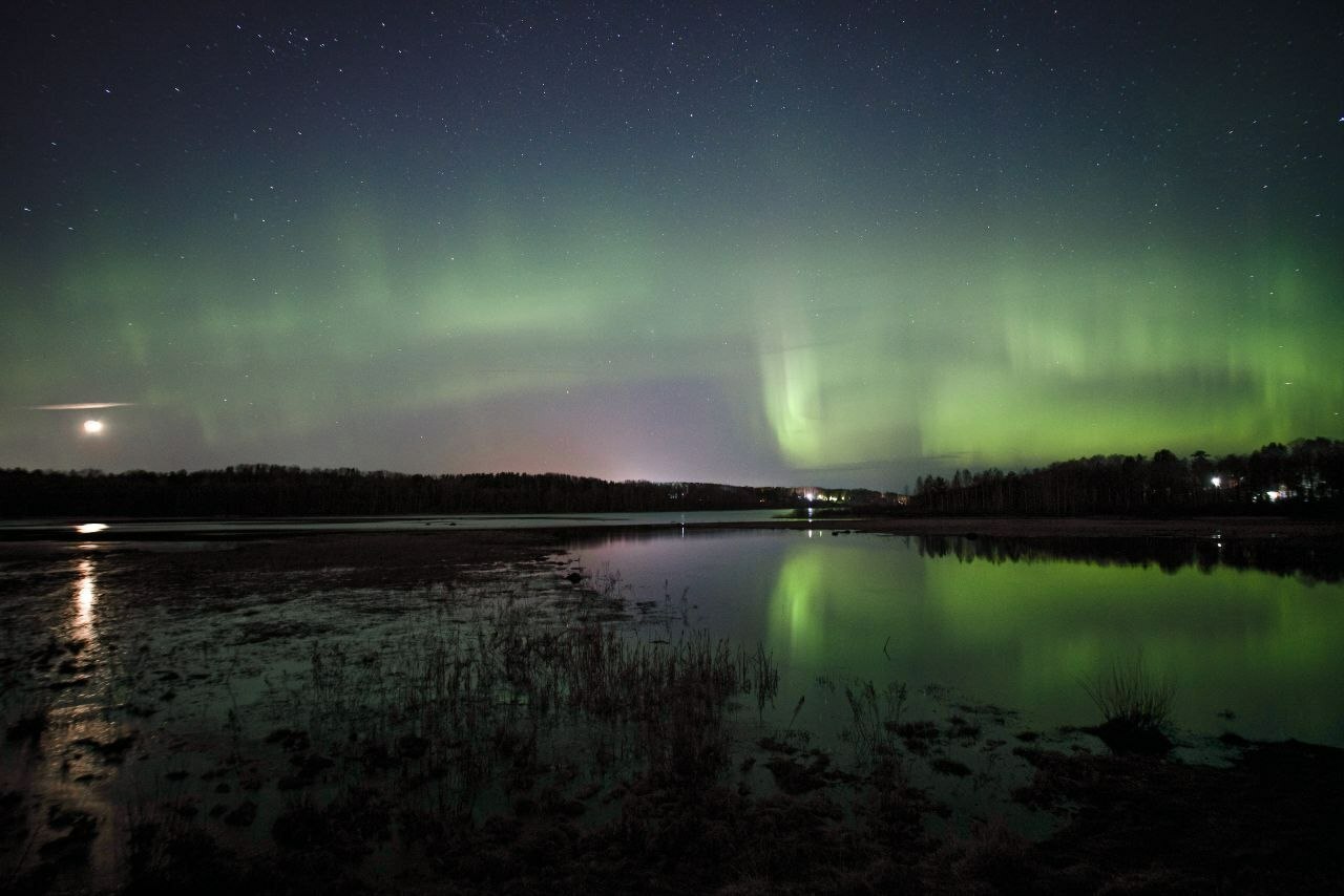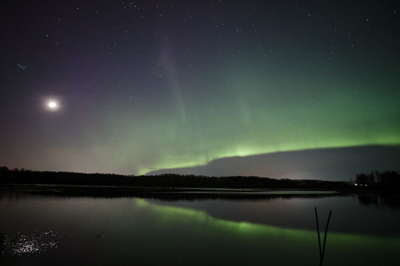 Однако в ночь с 22 на 23 марта над Лемболовским озером выдалась "золотая середина": лунный диск на небе был еще не полным, а аврора выдалась достаточно яркой. Получился идеальный компромисс, отмечает фотограф.