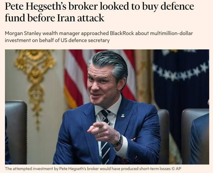 Ни дня без скандала на тему инсайдерской торговли в США. На этот раз в эпицентре оказался глава Пентагона Пит Хегсет. Financial Times выкатила статью-расследование, в которой сообщило, что брокер Хегсета из Morgan Stanley пытался вложить миллионы долларов в принадлежащий BlackRock биржевой фонд iShares Defense Industrials Active незадолго до начала американо-израильских ударов по Ирану.