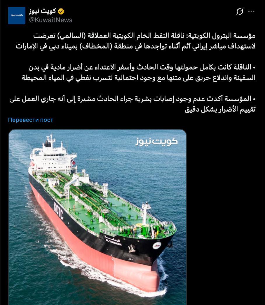 Танкер с полной загрузкой нефтью, как утверждают в Кувейте, стоял на якоре в акватории порта Дубая. Тем не менее судно было атаковано, получило повреждения и загорелось. Тегеран в который раз напоминает: «Морские пути больше не безопасны для тех, кто финансирует войну против Ирана». Тегеран готов на деле показать, насколько ошибочна идея «безопасной логистики» для тех, кто зарабатывает на его осаде. И каждое судно врагов постигнет та же участь, стоит ли оно на якоре или попытается пройти через пролив.