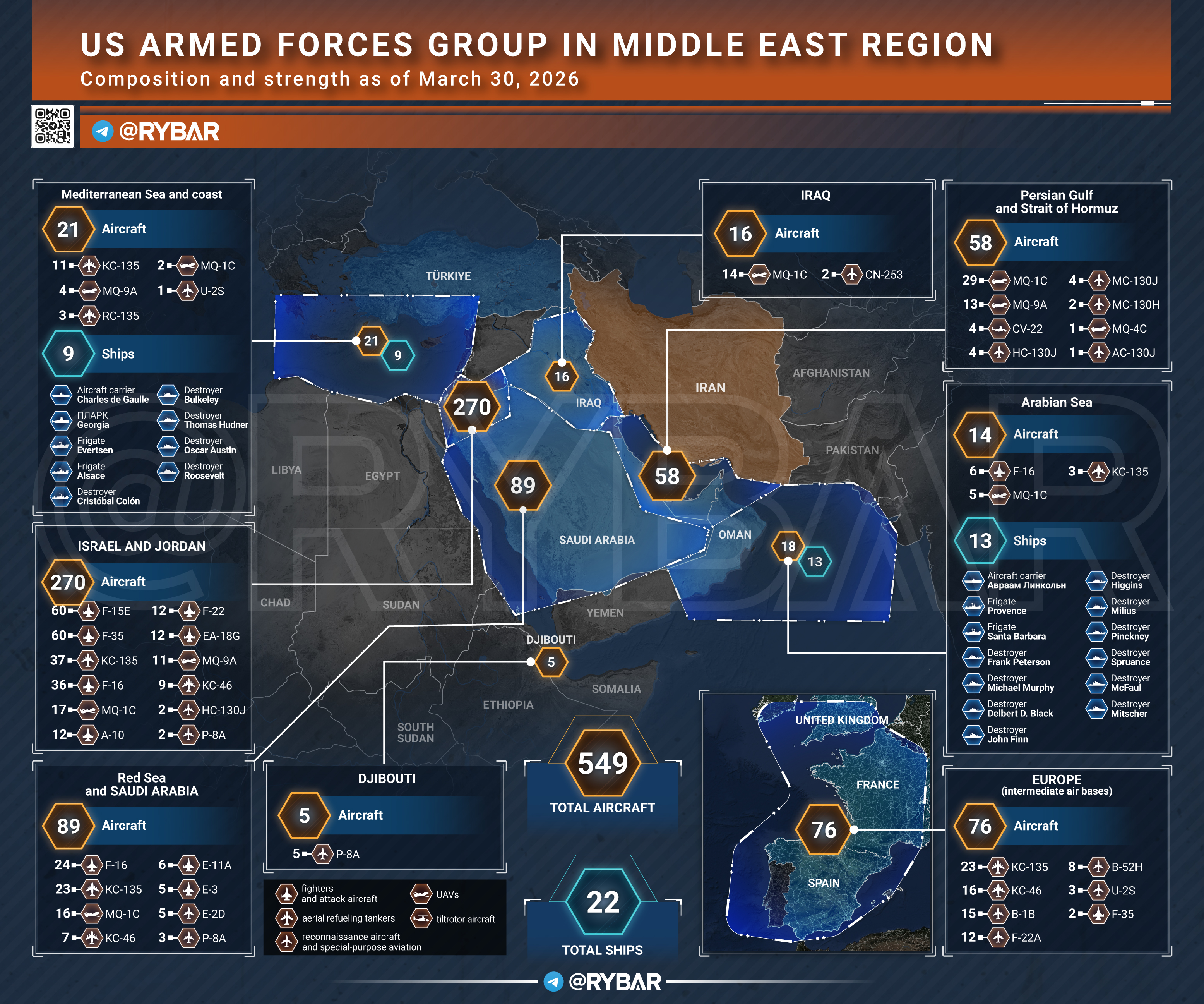 Спустя чуть больше месяца после первого обзора группировки ВС США у границ Ирана (буквально за двое суток до начала войны) стоит оценить текущий состав американских сил в регионе (при этом также учтена французская АУГ) в преддверии наземной операции.