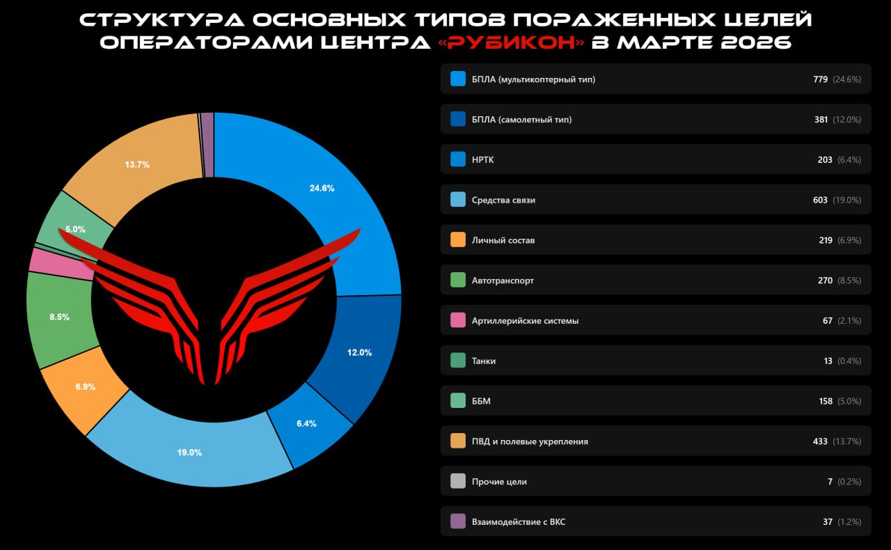Количество опубликованных эпизодов поражения целей противника операторами Центра "Рубикон" в марте 2026 составило3170.