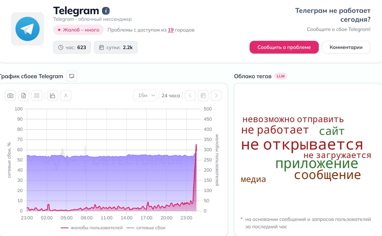 Количество жалоб на Telegram резко выросло за последние полчаса. Негодуют, судя по данным сайта detector404, из Петербурга, Москвы, Нидерландов и Брянска.
