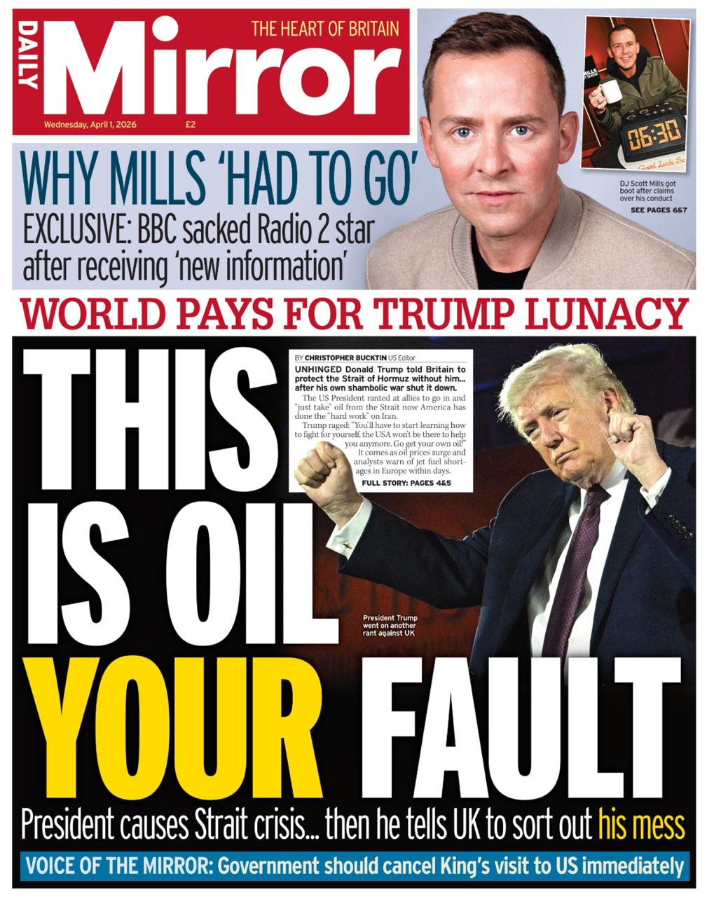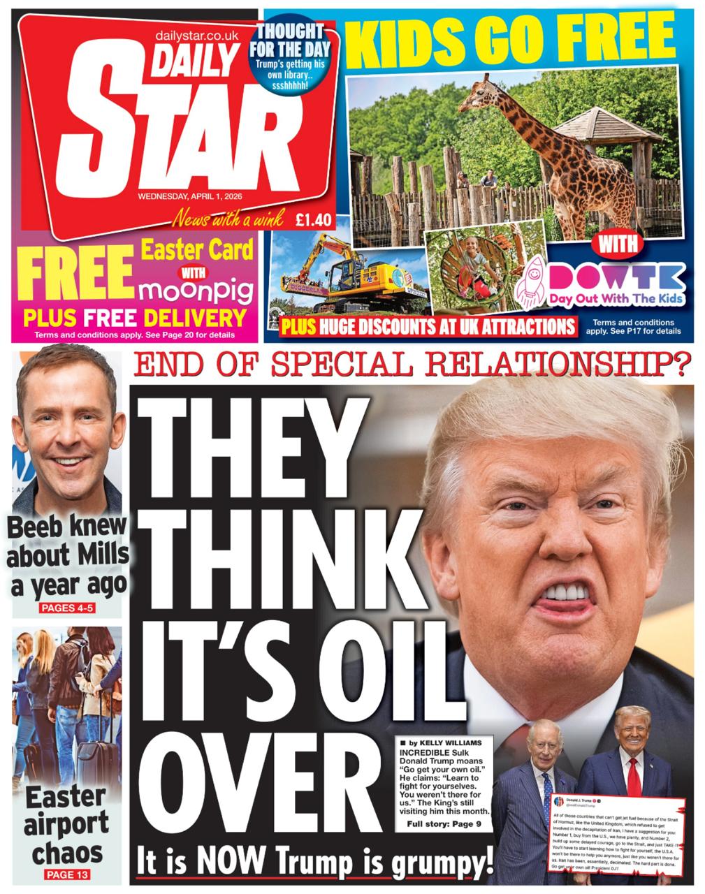 Целый ряд газет (например, Daily Mirror и Daily Star) призывают правительство срочно отменять государственный визит королька Чарльза в Америку, который запланирован на май. Но вчера Лондон официально подтвердил, что визит состоится, несмотря ни на что. «Специальные отношения» между США и Британией формально еще не отменены.