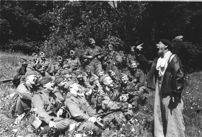 Фото: 1943 год, выпускник техникума циркового искусства Федор Игнатьевич Сухов в минуты отдыха на фронте развлекает своих боевых товарищей.