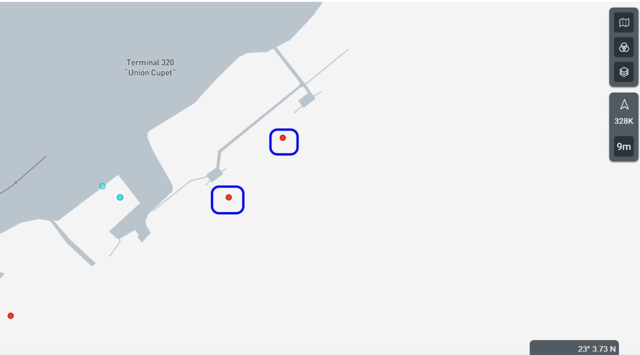 Далее скрин с морской онлайн-карты трафика. Мы видим, что оба узла терминала заняты неизвестными танкерами. Один очевидно "Анатолий Колодкин". Интересно, а кто второй ...? Который прибыл на Кубу на несколько дней раньше?