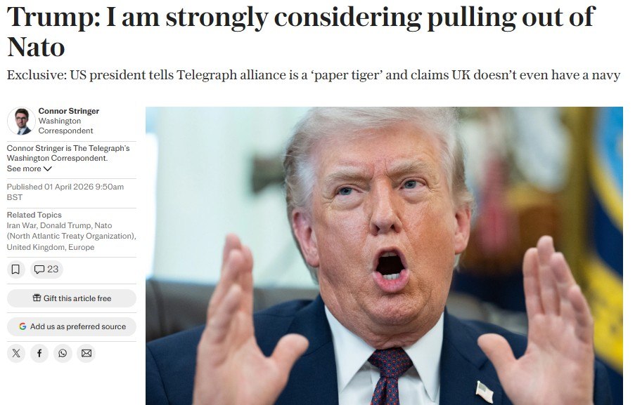 ‘Трампа спросили, пересмотрит ли он решение о членстве США в альянсе после конфликта. ‘О да, я бы сказал, что [это] не подлежит пересмотру, — ответил он. — НАТО никогда меня не убеждало. Я всегда знал, что это бумажный тигр, и Путин, кстати, тоже это знает’.