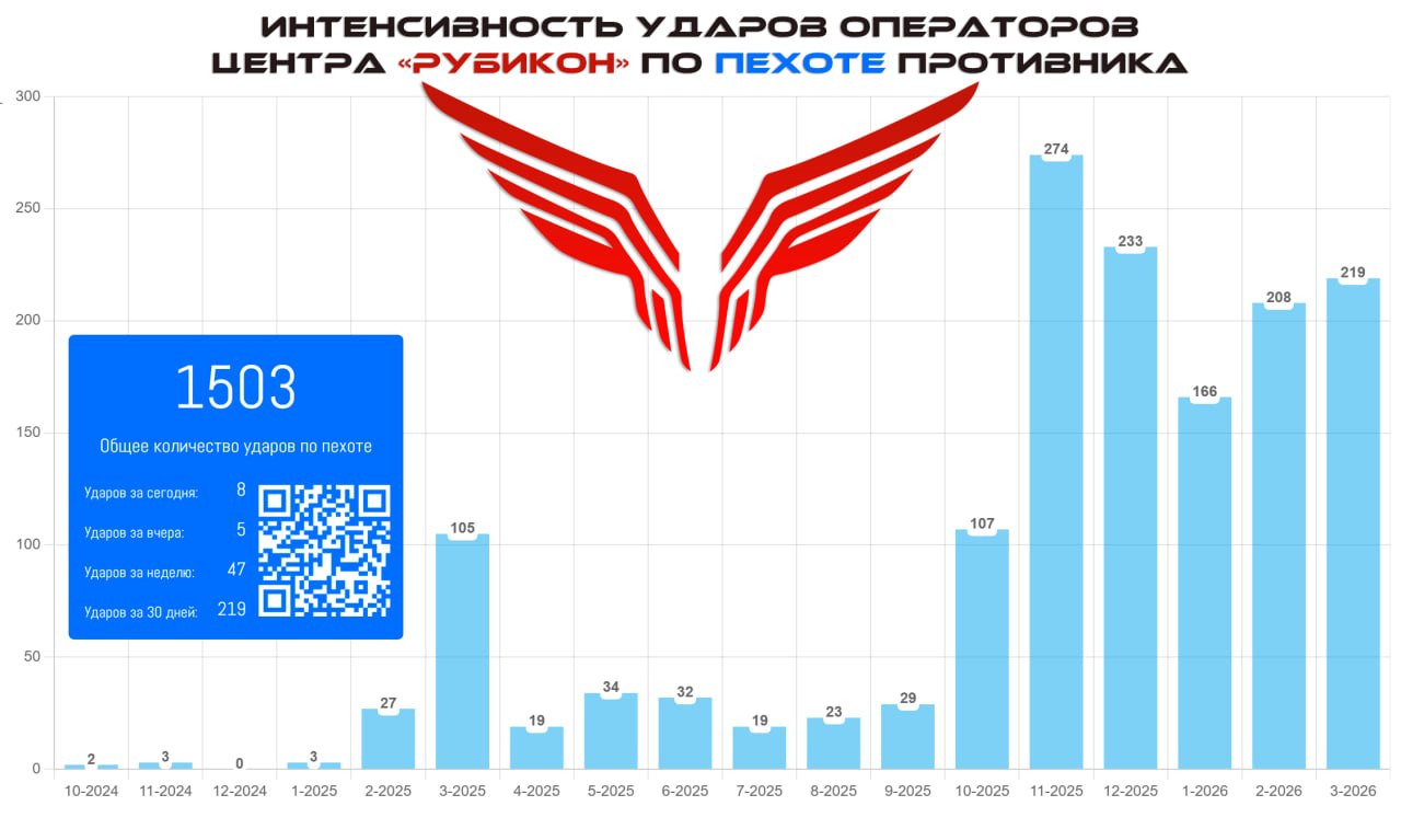 Операторы Центра "Рубикон" нанесли свыше 1500 ударов по пехоте противника вне укрытий, более 80% из которых опубликованы за последние полгода.