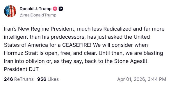 ‘Президент нового режима Ирана, значительно менее радикальный и гораздо более умный, чем его предшественники, только что обратился к Соединённым Штатам Америки с просьбой о прекращении огня! Мы рассмотрим это, когда Ормузский пролив будет открыт, свободен и безопасен. До тех пор мы будем уничтожать Иран полностью — или, как говорят, ‘возвращать его в каменный век!’