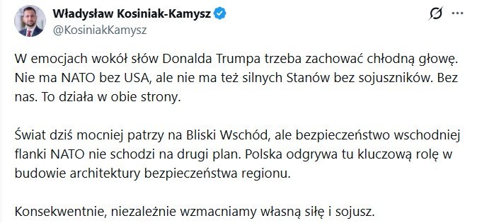 Министр обороны Польши Косиняк-Камыш в ответ на слова Трампа о выходе из НАТО: ‘Нет сильных США без нас’