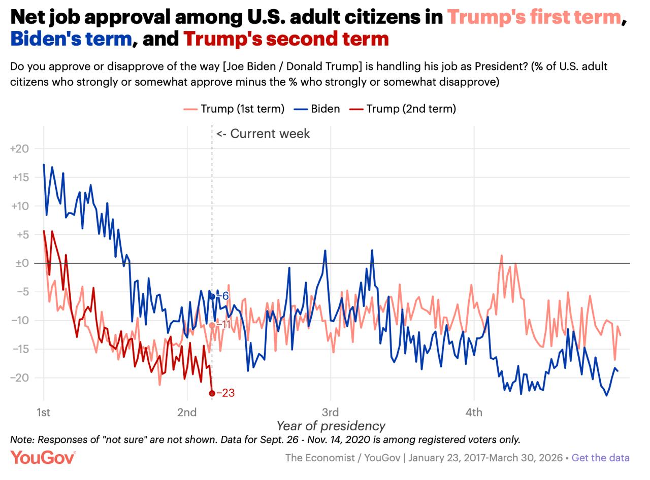 Белый дом во вражеской осаде. Что ни день, то новый разгромный опрос для команды Трампа. В исследовании Economist/YouGov рейтинг президента США рухнул до 35%. Причём он теряет свою электоральную базу. Среди избирателей Трампа уровень его поддержки за месяц войны упал с 84% до 76%.